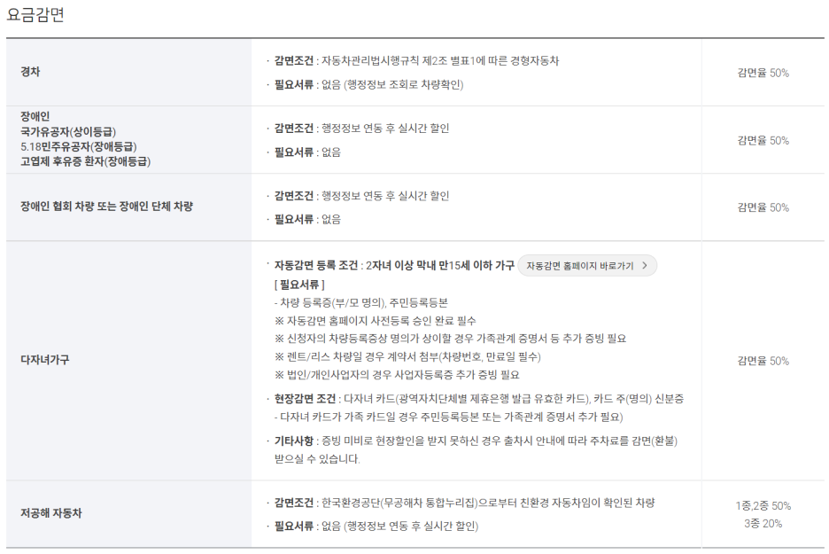 또한, 사전 등록, 현장 감면도 놓쳤다면 사후 환불도 가능하니 2자녀 이상의 다자녀 가구이면서 주차장을 이미 이용하셨다면, 아래 부분 설명도 참고 바랍니다.