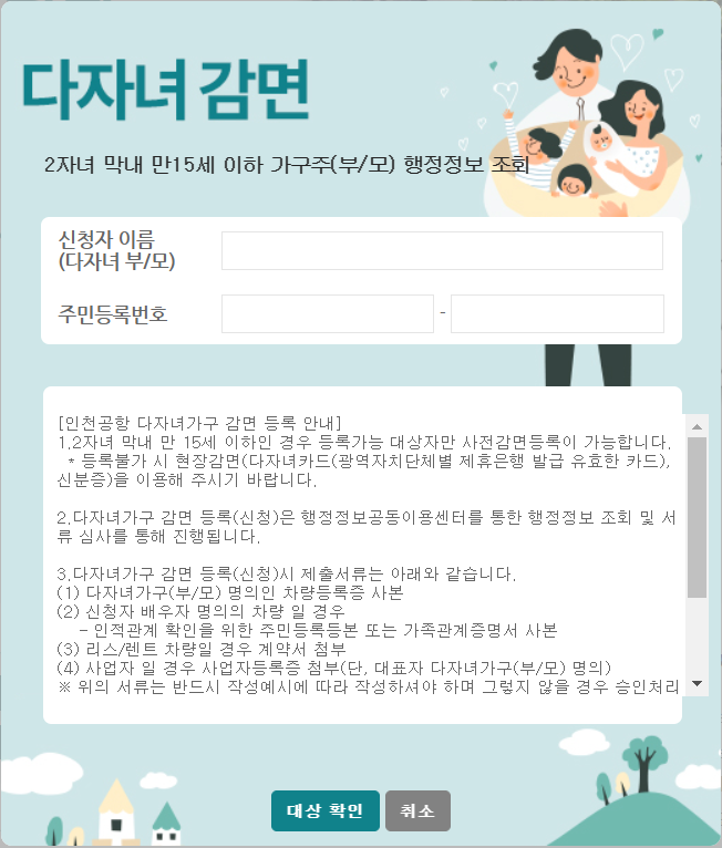 2.다자녀가구 감면 등록(신청)은 행정정보공동이용센터를 통한 행정정보 조회 및 서류 심사를 통해 진행됩니다.