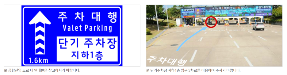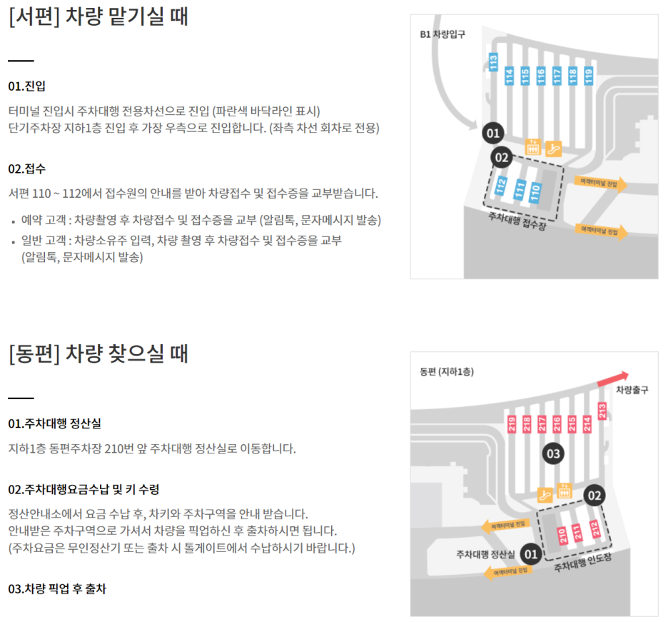 예전에는 바로 출발동 앞에서 차를 가져가곤 했는데, 몇 년 전부터는 공식 주차대행하는 주차장으로 이동하여 맡기게 됩니다. 물론 그곳에서 부터는 실내로 이어져 있어 비를 맞을 일은 없습니다.